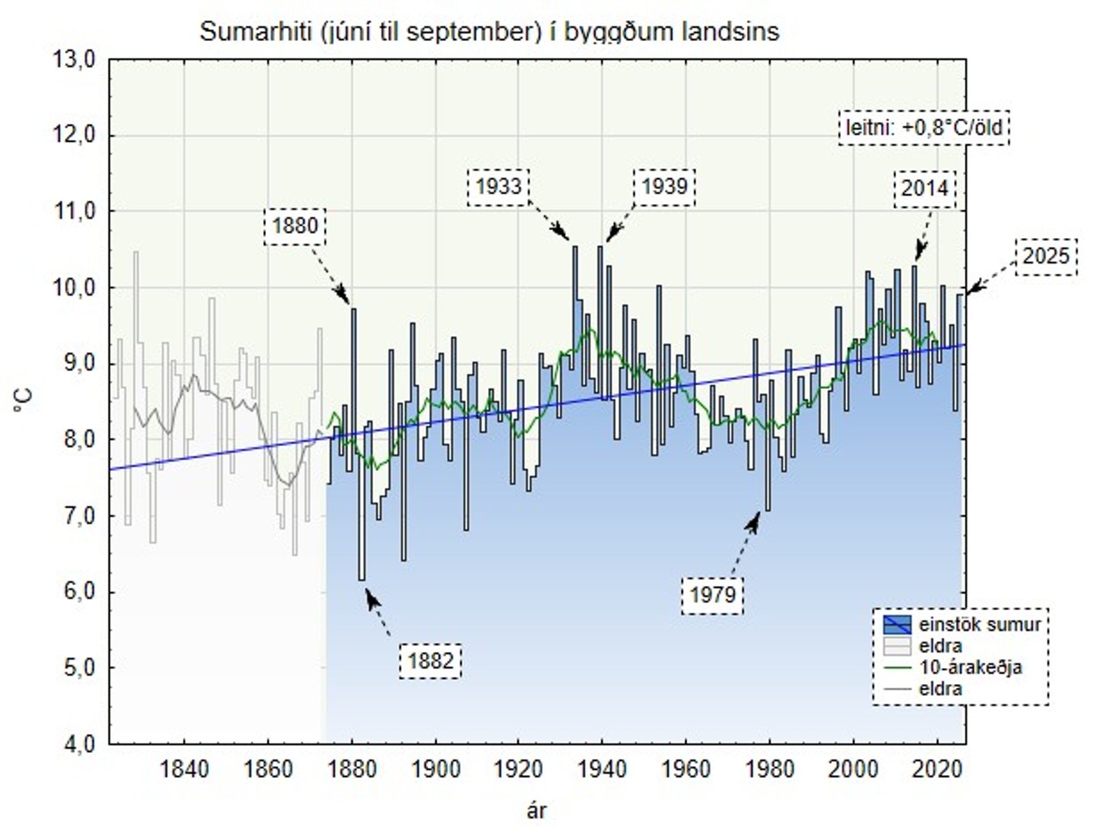 Meðalhiti veðurstofusumarsins 2025 reiknast 9,9 stig, 1,5 stigi hærra heldur en í fyrra, 2024. Það sumar var hið kaldasta það sem af er öldinni, en sumarið í ár er meðal þeirra 7 hlýjustu á öldinni. Sé litið lengra aftur voru aðeins fjögur sumur á allri 20. öld hlýrri heldur en þetta. Við bíðum þó enn sumars sem slær út 1933 og 1939 þegar litið er til landsins alls. Sumarið 1979 sker sig úr á köldu hliðinni, þá það kaldasta allt frá 1907 að telja.