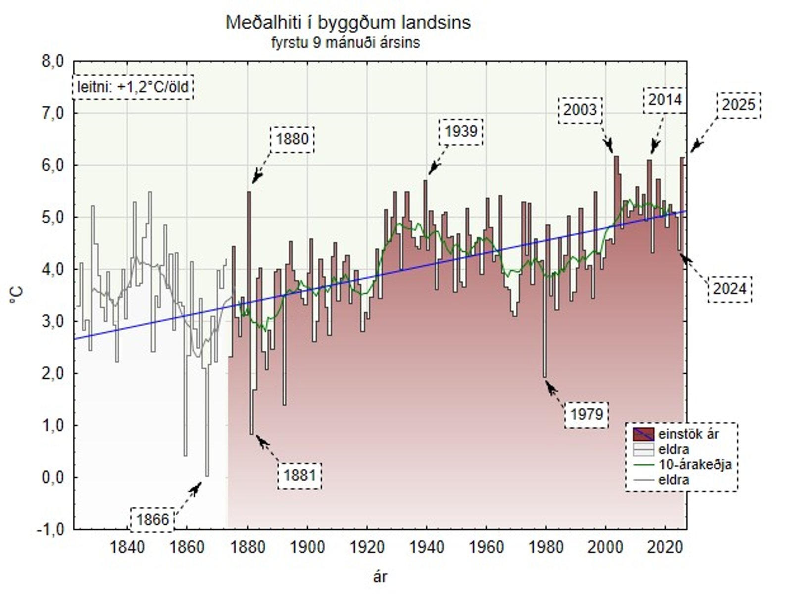 Myndin sýnir meðalhita á landsvísu fyrstu 9 mánuði hvers árs. Árið í ár, 2025 er alveg við toppinn, ómarktækur munur á því og fyrstu níu mánuðum áranna 2003 og 2014. Enn sker 1979 sig mjög úr, á köldu hliðinni. Fyrstu níu mánuðir þess árs voru þeir köldustu á landsvísu síðan 1892. Þótt meðalhiti fyrstu 9 mánaða ársins sé góður vísir um ársmeðaltalið er það samt þannig að stundum verða miklar breytingar um þetta leyti árs. Árið 1979 hlýnaði t.d. að mun þannig að þótt árið í heild yrði áfram það kaldasta varð munurinn á því og öðrum árum ekki alveg jafn sláandi og hér er sýnt. Árið 1880 var þessu öfugt farið. Fyrstu 9 mánuðir þess árs voru hlýir, sérstaklega ef miðað er við ástandið almennt á síðari hluta 19. aldar. Þá urðu mikil umskipti til hins verra og við tók mjög kalt haust og einstaklega kaldur vetur. Haustin 1881 og 1882 voru líka nokkuð úr takti við það sem áður hafði verið þau árin - eins og frægt er var október 1882 hlýjasti mánuður ársins í Grímsey (það gerðist líka þar 1915).