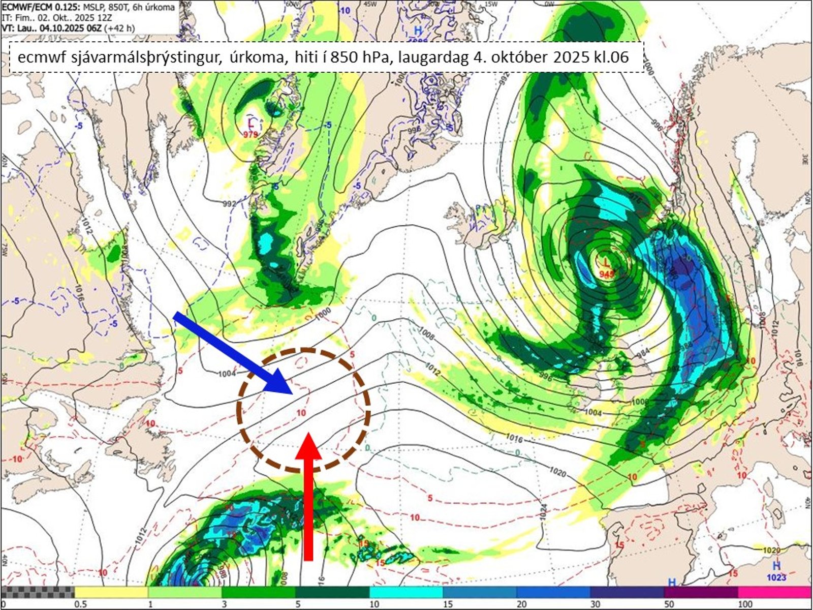 Svo virðist sem hlýindi úr vestri eigi að ganga inn á svæðið upp úr helginni og þrýsta að þeim kulda sem haustið er að reyna að búa til yfir norðurslóðum. Langtímaspár (sem eru auðvitað mjög óvissar) reyna að segja okkur af mjög sterkum háloftavindum um miðja vikuna og gangi þeir yfir Ísland. Rétt að fylgjast nánar með því - ef miðstöðvarnar skipta ekki um skoðun.